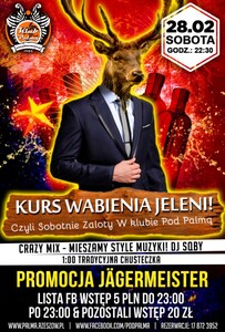 Gotowi na #polowanie? W ostatnią sobotę lutego zapraszamy na kurs wabienia Jeleni – obecność obowiązkowa!!! Niech nie zmyli Was nazwa imprezy… Tej nocy będziecie mogli liczyć na świetną promocję Jägermeistera